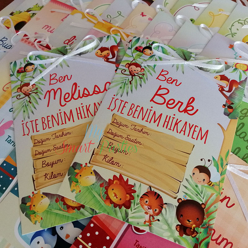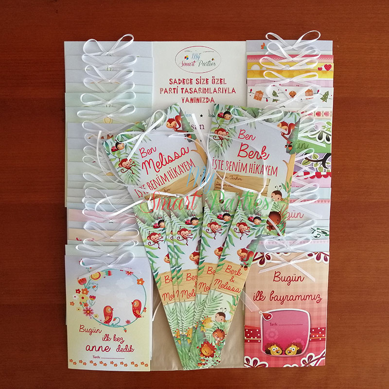 İkiz Bebek Anı Kartlarımız, sevimli hayvancık temalı aylık kartlardan ve ikiz bebeklerinizin ilk 1 sene yaşadıklarıyla ilgili ilklerinin yer aldığı kartlardan oluşmaktadır. "Ben .... İşte Benim Hikayem" Kartlarını da doğum kartı gibi düzenliyoruz; bebeklerinizin ismini ve doğum bilgilerini (tarih,saat,kilo,boy) iki ayrı karta yazıyoruz. Eğer bebekleriniz doğmadıysa bilgilerin karşılarını boş bırakıyoruz, siz bebekleriniz doğunca bilgilerini yazıyorsunuz. Sevimli Hayvancık Temalı Kartlarımız dışında farklı bir tema ile de ikizleriniz için kartlar hazırlayabiliriz
