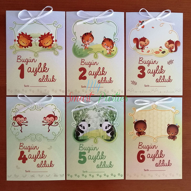 İkiz Bebek Anı Kartlarımız, sevimli hayvancık temalı aylık kartlardan ve ikiz bebeklerinizin ilk 1 sene yaşadıklarıyla ilgili ilklerinin yer aldığı kartlardan oluşmaktadır. "Ben .... İşte Benim Hikayem" Kartlarını da doğum kartı gibi düzenliyoruz; bebeklerinizin ismini ve doğum bilgilerini (tarih,saat,kilo,boy) iki ayrı karta yazıyoruz. Eğer bebekleriniz doğmadıysa bilgilerin karşılarını boş bırakıyoruz, siz bebekleriniz doğunca bilgilerini yazıyorsunuz. Sevimli Hayvancık Temalı Kartlarımız dışında farklı bir tema ile de ikizleriniz için kartlar hazırlayabiliriz